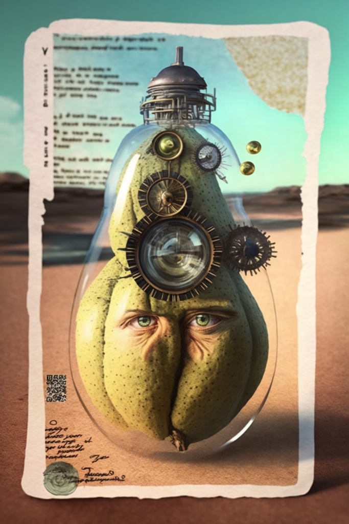 One of the resulting AI images that impressed me most when I first saw it, shows a kind of military surveillance pear drone. I mixed Nicola’s image with someone’s prompt that conjured an armored military vehicle. The result is magical. The image is vertically oriented and looks a bit like a card or a poster. There’s a rough white frame within the image that frames the drone itself. The frame is stamped and written on, in the style of a military report; that’s how the AI interpreted the text in Nicola’s original image. The scene is a sand dune in a desert with a few scrubby grasses. The drone is a pear with two human eyes, pale blue and reliable, oriented horizontally, looking at the viewer. The pear is within a clear shell of a material that looks like glass or plastic but is probably much stronger, as well as weightless. The shell has a built-in, huge, versatile camera as well as several other sensing apparatuses. I liked the pear drone because it made connections I would not have made by myself, at least not consciously. In that sense, AI art* is like long-lasting images from lucid dreams. Like a figure in a dream, the pear drone seems to be communicating, if only with their eyes.
