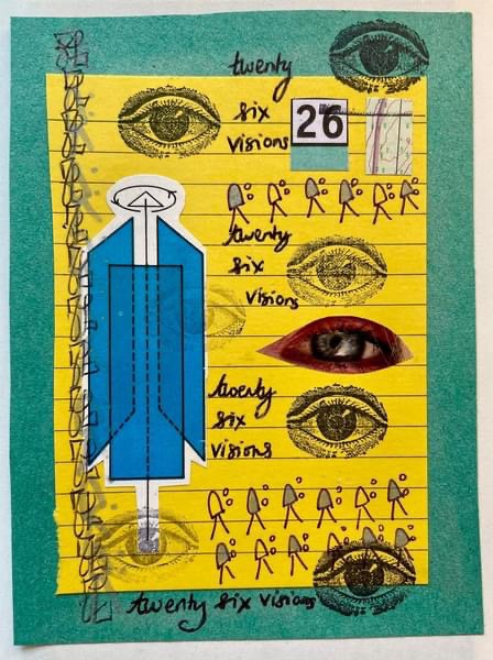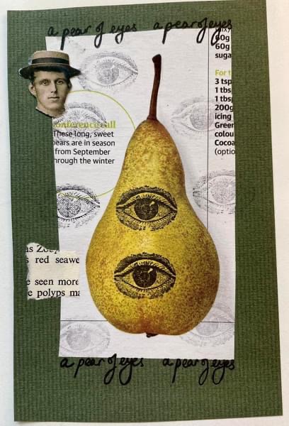 Nicola: I was drawn to the original analogue collages that these digital images are based on when I was revisiting a sketchbook I had kept over the Covid lockdowns. In this particular trio of collages, one of the main visual motifs is impressions from an eye rubber stamp I have from a commercial set. I have also used puns on words in these pieces: the eye rubber stamp impressions appear alongside a pear fruit, and so I then wrote “a pear of eyes” across the collage multiple times. When I first started glitching about a year ago, I started to see my analogue works anew. This particular set of collages jumped out at me straight away – they were begging to be glitched!